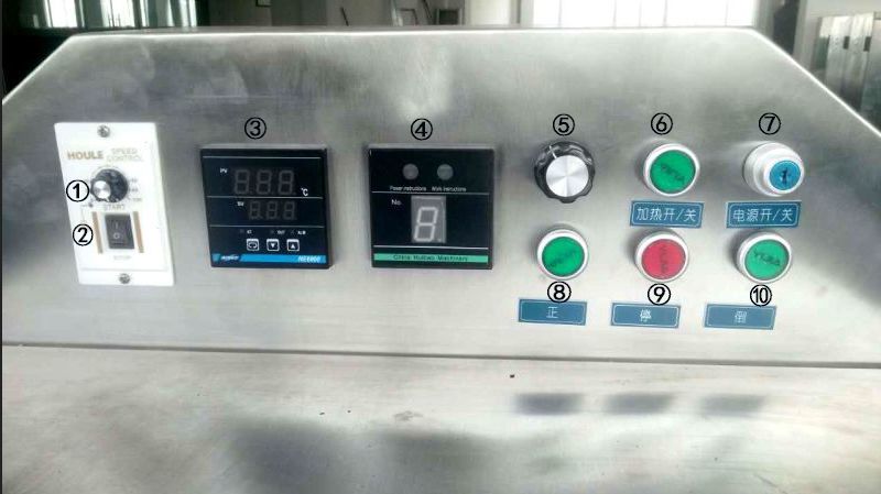 五、调节炒锅转速:调节图片上“①调速器旋钮(正面白色)”,顺时针调节加速,逆时针调节减速。(注:可根据炒制品特性,适当调整。)